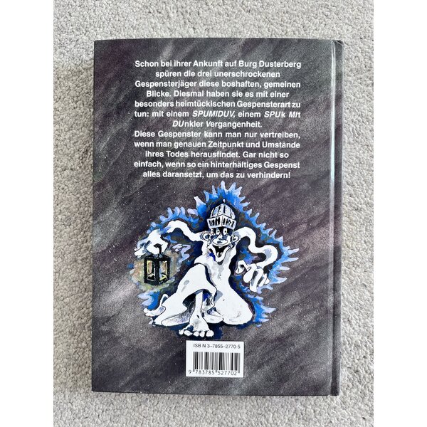 Schon bei ihrer Ankunft auf Burg Dusterburg spüren die drei unerschrockenen Gespensterjäger diese boshaften, gemeinen Blicke. Diesmal haben sie es mit einer besonders heimtückischen Gespensterart zu tun: mit einem SPUMIDUV, einem SPUk MIt DUnkler Vergangenheit. Diese Gespenster kann man nur vertreiben, wenn man genauen Zeitpunkt und Umstände ihres Todes herausfindet. Gar nicht so einfach, wenn so ein hinterhältiges Gespenst alles daransetzt, um das zu verhindern!