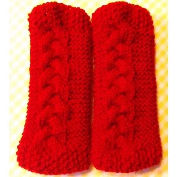 Von mir gestrickte Armstulpen mit Zopfmuster aus Synthetikgarn.