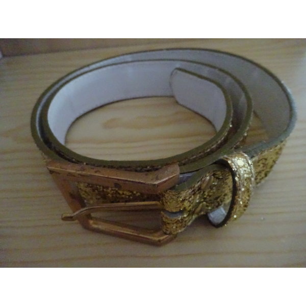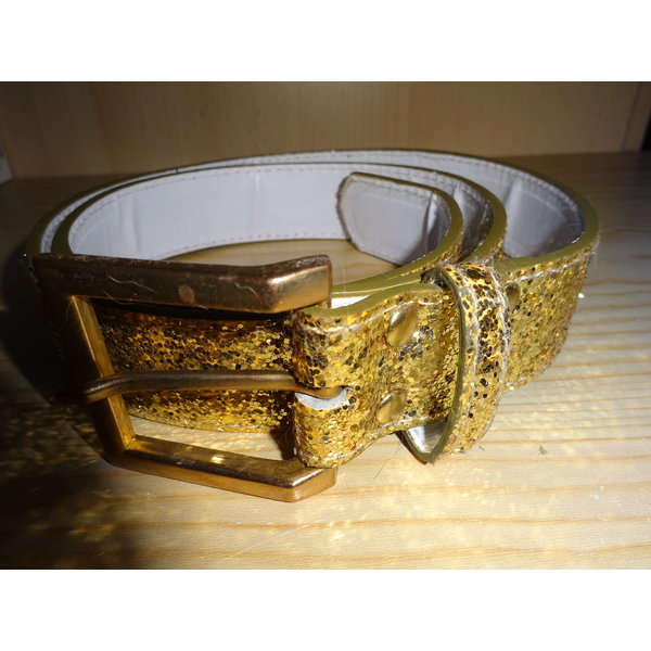 Glitzernder Gürtel mit klassischer Gürtelschnalle, er ist ca. 85 cm lang und 3,2 cm breit. Die Länge ist zusätzlich vom Hersteller auf der Gürtelrückseite (diese ist weiß) dezent eingestanzt.