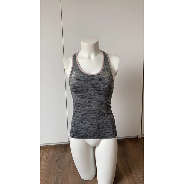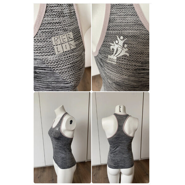 Tolles Sporttanktop mit Ringerrücken. Grau meliert mit rosa Umrandung. Silberner Print „Berlin“ und Brandenburgertor auf der Brust.