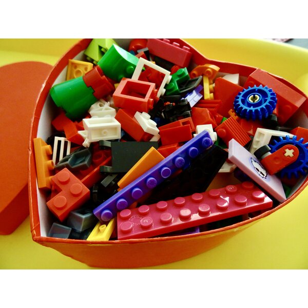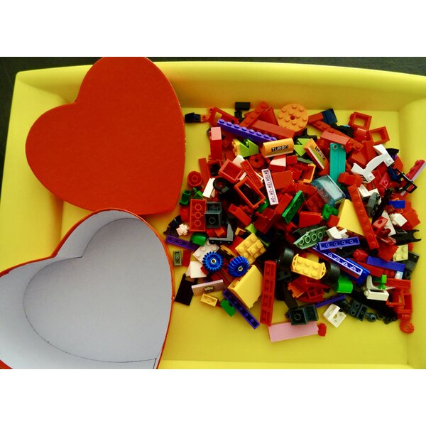 In der hübschen herzförmigen Dose (mit Deckel) sind über 300 Gramm Klemmbausteine, alles kompatibel, auch echtes Lego. Alles vom Foto. Ich gebe gern Rabatt, wenn Sie noch etwas anderes bei mir bestellen