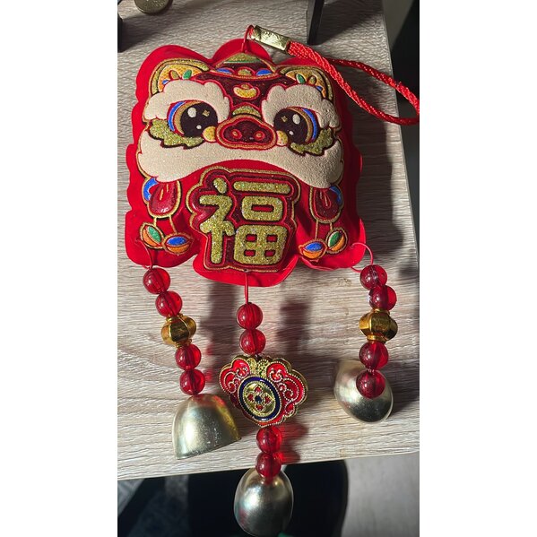 Nur die Figur, ohne die Perlen mit den Glocken und der Aufhängung ist 13 cm lang und ca. 12 cm breit.Die Figur ist toll verarbeitet. Auf der Rückseite ist dasselbe Gesicht zu sehen. Die Glocken bimmeln bei Bewegung.
