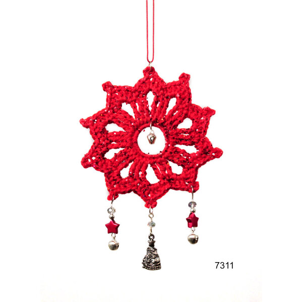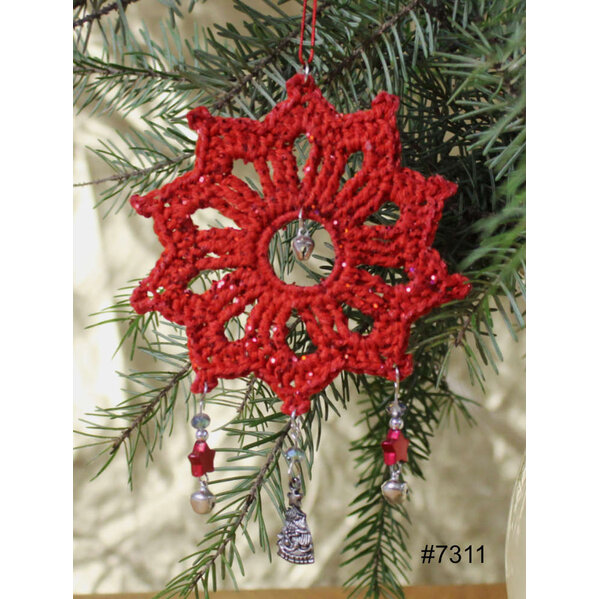 Der Stern ist von mir gehäkelt, dauerhaft gestärkt, mit Glitzer bestreut, mit Perlen und Glöckchen verziert.