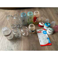 Großes Set Babyfläschchen - Insgesamt 8 Flaschen (1x Glas, 7x Plastik), 8 Ringe, 4 Deckel und 2 neue Sauger