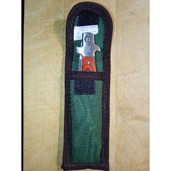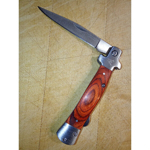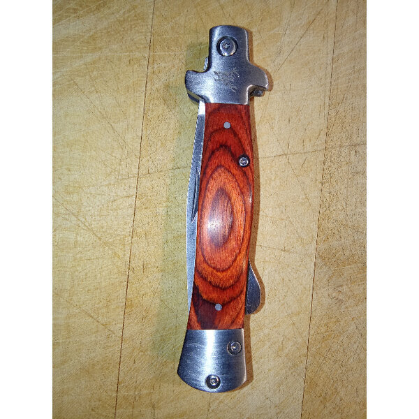 Kleine Hirschgravur an einem der Segmente. Messer hat Sicherungshebel für das Öffnen und Schließen. Alle Segmente, auch die seitlichen Holzimitate sind verschraubt. Kein Versand an Packstationen