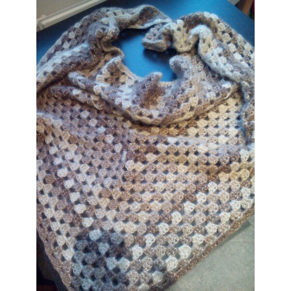 Schönes, großes Dreiecktuch, gehäkelt aus flauschigem Garn ( 55 % Polyacryl, 22 % Polyester, 6 % Nylon und 17 % Metallic). Der Metallic-Anteil zeigt sich nur sehr diskret. Ein herrlich kuscheliges Tuch.
