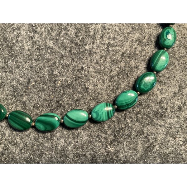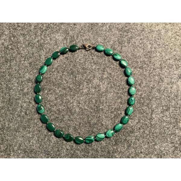 Sie besteht aus 28 flachen und ovalen Steinen, ist auf ein Drahtseil aufgezogen.Verschluss Karabinerhaken, der einzelne Sein ist ca 15 mm lang und ca. 10 mm breit. Zwischen den Steinen sind winzige runde silberfarbene Perlen, die etwas angelaufen sind.