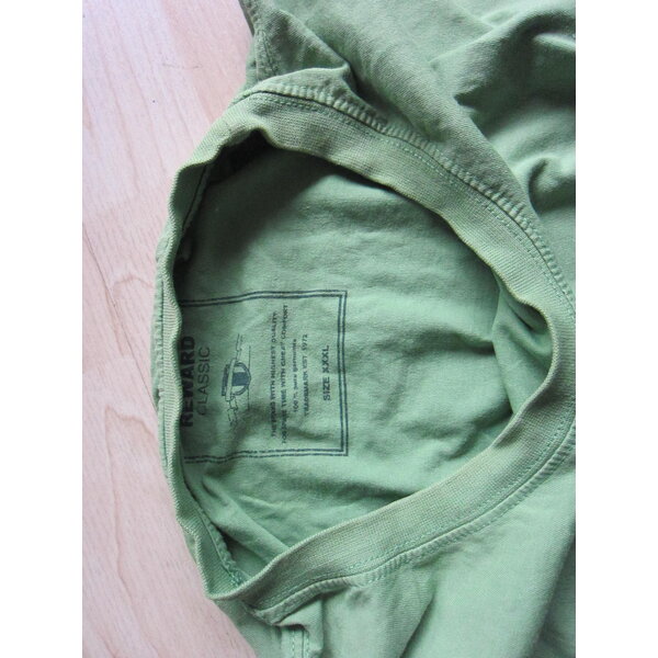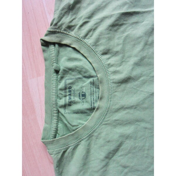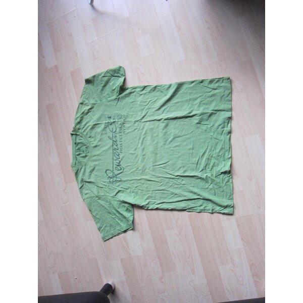 Das T-Shirt ist uni grün mit einem Aufdruck vorne in dunkelgrün. Sonst ohne weitere Extras. Die einfache Brustweite ist 58 cm und die Gesamtlänge 76 cm.