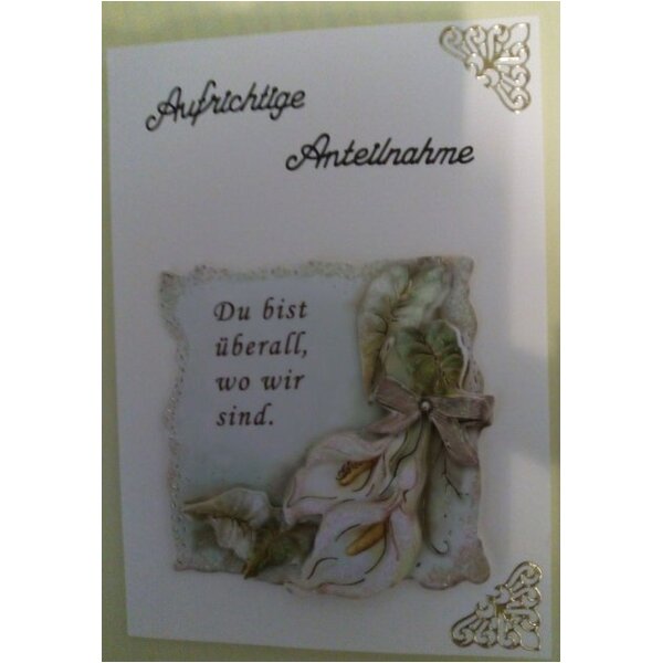 2:1 Angebot, bitte teilt mir zeitnah nach der Anforderung die 2. Kartennummer mit, danke: Auf eine helle Karte im Leinen-Look habe ich in 2 Ecken filigrane Motive geklebt, die große Spruchtafel mit weißen Callas sagt "Du bist überall wo wir sind" und glitzert. Da das Motiv schon stark glitzert, habe ich hier die schwarze Schrift gewählt. Zum Beschreiben füge ich ein helles Innenblatt mit bei und für den Postversand einen weißen Umschlag. Jede Karte steckt in einer Folie zum Schutz.