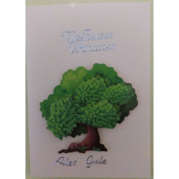 2:1-Angebot, bitte teilt mir zeitnah nach der Anforderung die 2. Kartennummer mit, danke: Auf eine helle Karte habe ich hier die Grüße "Mit besten Wünschen Alles Gute geklebt", dazu ein sehr großer & breiter Baum in 3 D-Optik. Die Karte kann innen beschrieben werden, für den Postversand habe ich einen weißen Umschlag beigefügt. Jede Karte steckt in einer Klarsichthülle.