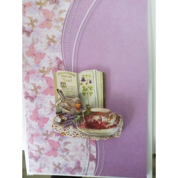 2:1-Angebot - Grußkarte Blume+Schmetteling violett mit Buch, Vogel + Teetasse #206 - Diese violett-pink Karte mit Blumen + Schmetterlingdruck wurde mit einem 3 D-Motiv in Form von einem aufgeschlagenen Kräuterbuch mit Rotkehlchen und Teetasse beklebt, das Motiv glitzert. Auf eine Aufschrift habe ich bei dieser Karte bewusst verzichtet, die Karte ist individuell nutzbar und innen mit der weißen Seite problemlos beschreibbar, wie auch der weiße Papierumschlag.