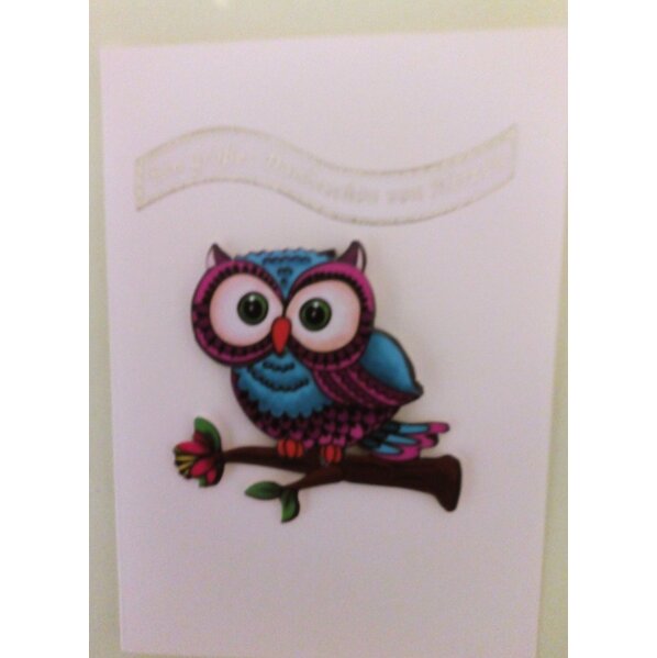 2:1-Angebot, bitte teilt mir nach der Anforderung zeitnah die 2. Kartennummer mit, danke. Die helle Karte habe ich mit einem mehrmaligen 3 D-Motiv Eule - hier in pink mit blau - beklebt, darüber das geschwungene Schriftband "Ein großes Dankeschön von Herzen". Dazu gibt es einen hellen Umschlag für den Postversand, die Karte steckt zum Schutz in einer Folie.
