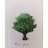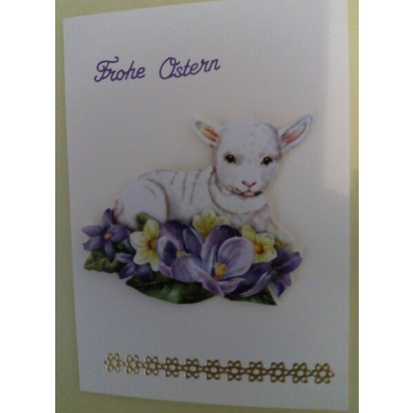 Diese weiße Leinen-Karte habe ich mit einem mehrlagigen 3 D-Motiv beklebt und mit Blumengirlande unten und violetter Schrift oben verziert. Das Motiv glitzert goldfarben. Zum Beschreiben lege ich bei Leinenkarten ein helles Innenblatt bei, für den Postversand einen weißen Umschlag und jede Karte steckt in einer schützenden Hülle.