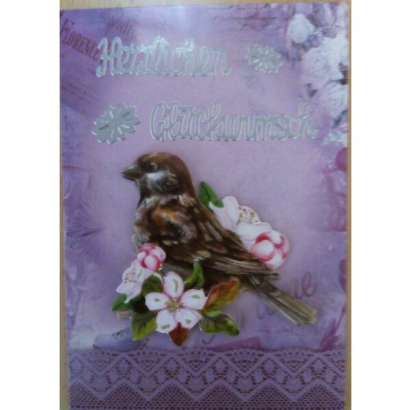 2:1-Angebot, bitte teile mir zeitnah nach der Anforderung die 2. Kartennummer mit, besten Dank: Auf eine Vintage Grußkarte mit Spitzenborte unten habe ich den großen Gruß "Herzlichen Glückwunsch - passt nicht nur zum Geburtstag. Dazu silberne Blumensticker. Das 3 D-Vogelmotiv glitzert multifarben, hier ist weniger mehr (Verzicht auf weiteres Blingbling). Auf eine Klarsichtfolie als Verpackung verzichte ich hier, aber zum Versand verpacke ich alle Karten in einer Klarsichtfolie als Schutz.
