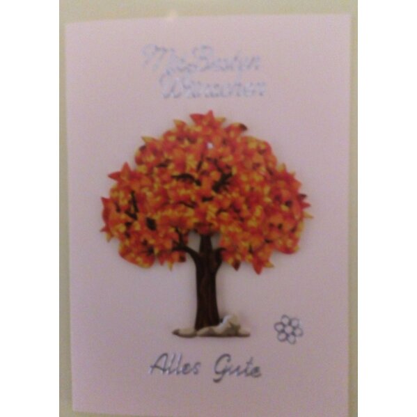 2:1-Angebot - bitte teilt mir nach der AF die weitere Kartennummer mit, danke: Diese cremefarben Karte aus Karton mit weißem Papierumschlag ist im normalen Postkartenformat 10 x 15 cm. Ich habe sie mit einem 3 D-Motiv mit einem herbstlich-roten Baum beklebt und mit den Stickern "Mit besten Wünschen Alles Gute" sowie einer Blüte beklebt. Innen ist die Karte unbedruckt und kann problemlos beschrieben werden. Ich verzichte auf die Einzelverpackung in Folie bei meinen Karten aber schütze sie auf dem Transport mit einem Frühstücksbeutel, der weiter verwendet werden kann.
