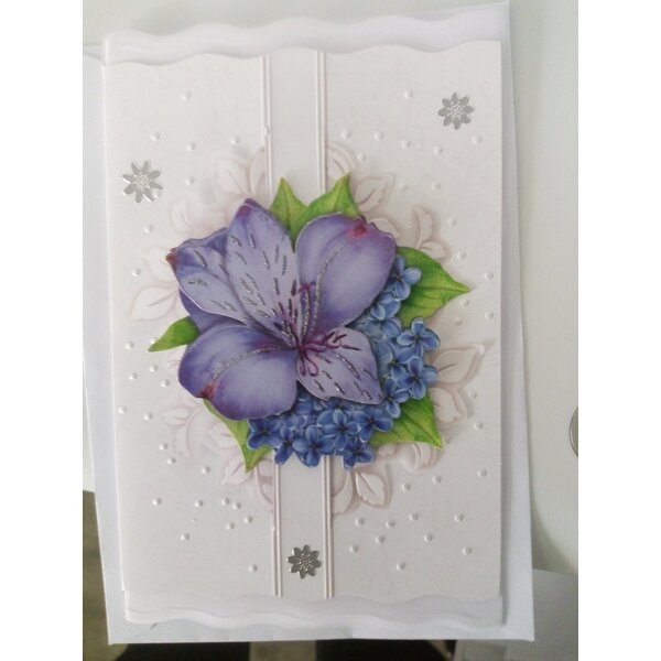 Diese edle Karte habe ich mit einem 3 D-Blumenmotiv beklebt, dieses Motiv sind kleine blaue Blüten unter einer großen violetten Blüte, die an eine Lilie erinnert (aber bei Lilien kenne ich kein blau). Rings um das große Blumenmotiv in der Mitte habe ich 3 silberne Blüten geklebt - aber auch bei dieser aufwändig gestalteten Blumen-Karte habe ich bewusst auf eine Aufschrift verzichtet. Die Karte kann für viele Gelegenheiten genutzt werden und auf dem Innenblatt beschriftet werden. Für den Versand ist ein weißer Umschlag dabei aber ich verzichte bei den Karten überwiegend auf Einzelverpackung mit Folie - schütze jedoch für den Transport alle Artikel, die ich verschicke mit einem Beutel (dieser kann weiter verwendet werden und ist damit nachhaltiger als eine Einzelverpackung).
