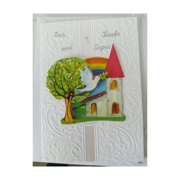 2:1-Angebot: Grußkarte Taufe - hier vereinen sich viele christliche Motive: Der Baum der Erkenntnis, die fliegende Taube, ein Regenbogen und eine Kirche, im Schnabel der Taube ein Mistelzweig und dazu der Schriftzug Zur Taufe viel Segen mit einem Kreuz. Die edle geprägte weiße Karte kommt mit einem schlichten weißen Umschlag. Dieses Motiv wurde mit wenigen silbernen Streifen etwas verziert aber es glitzert nicht wie viele meiner 3 D-Motive!