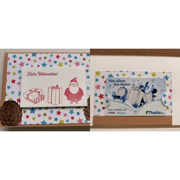 Grußkarte mit Umschlag - auf der Innenseite ist ein Einleger in den sich eine handelsübliche Gutscheinkarte einstecken lässt siehe Startfoto. Die dort zu sehende Gutscheinkarte ist nicht Teil des Angebots - in liebevoller Handarbeit gestempelt und koloriert. Die Karte ist folienverpackt