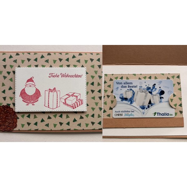 Grußkarte mit Umschlag - auf der Innenseite ist ein Einleger in den sich eine handelsübliche Gutscheinkarte einstecken lässt siehe Startfoto. Die dort zu sehende Gutscheinkarte ist nicht Teil des Angebots - in liebevoller Handarbeit gestempelt und koloriert. Die Karte ist folienverpackt