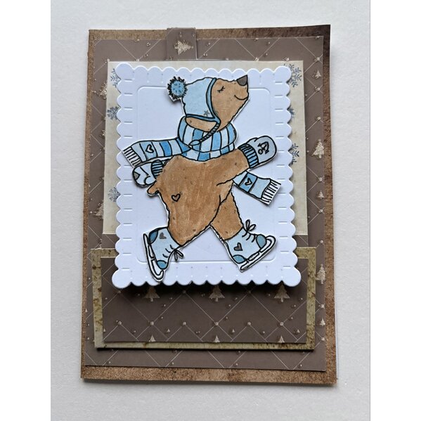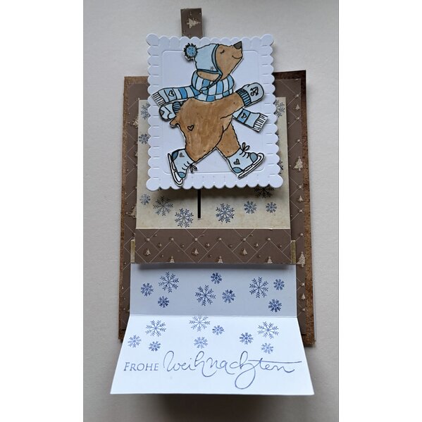 Zieht man oberhalb des Bären an dem Papiersteg öffnet sich die Karte und man sieht das Frohe Weihnachten. Der Ziehmechanismus mit dem Bären ist auf eine Klappgrußkarte gebaut, die Innenseite ist wie bei jeder anderen Grußkarte beschreibbar - in liebevoller Handarbeit gestempelt und koloriert. Die Karte ist folienverpackt