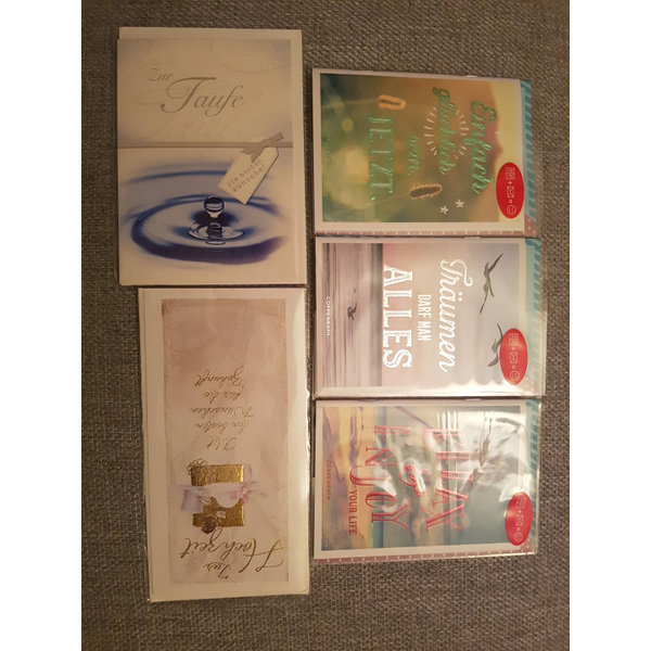 3 x Buch Umschlag (Grußkarte mit 6 Doppelseiten mit diversen Sprüchen, 1 Seite für eigenen Text) incl. Umschlag, 1x Grußkarte zur Taufe incl. Umschlag, 1x Grußkarte zur Hochzeit incl. Umschlag