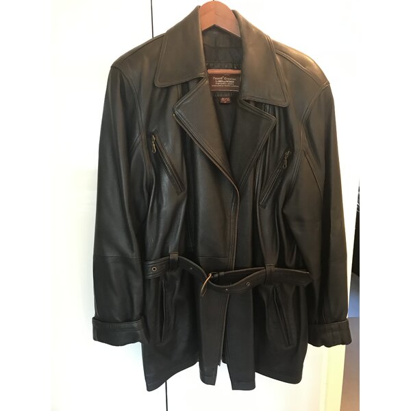 Biete eine sehr gut erhaltene Damenlederjacke der Marke Tesatti Creation in Gr. 42, dunkelbraun, ganz wenige Tragespuren,super weiches Leder, allerdings aufgrund der Enge des Schrankes 2 Druckstellen, einmal am linken Ärmel und an der linken Tasche (siehe Fotos). Die Jacke wird mit Reissverschluss und Gürtel geschlossen, 2 Aussentaschen und 2 Reissverschlusstaschen in Brusthöhe, innen eine mit Knopf verschließbare Tasche. Länge 83cm, Schulterbreite 50cm.