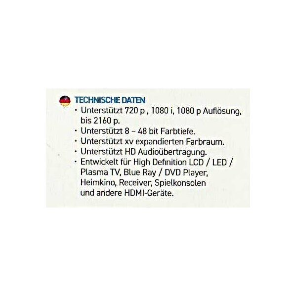 - Entwickelt für High Definition LCD/LED/ Plasma TV, Blue Ray / DVD Player, Heimkino, Receiver, Spielkonsolen und andere HDMI-Geräte.