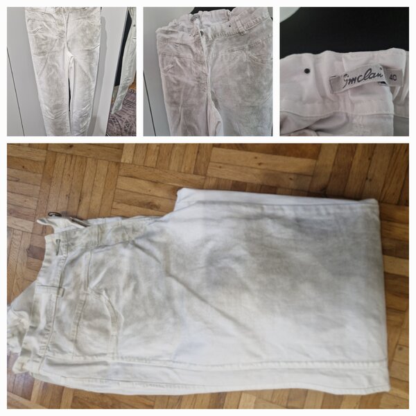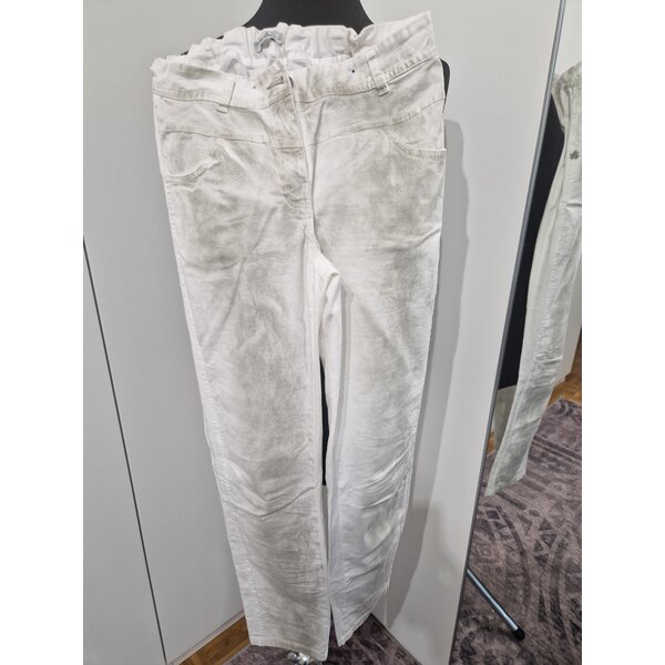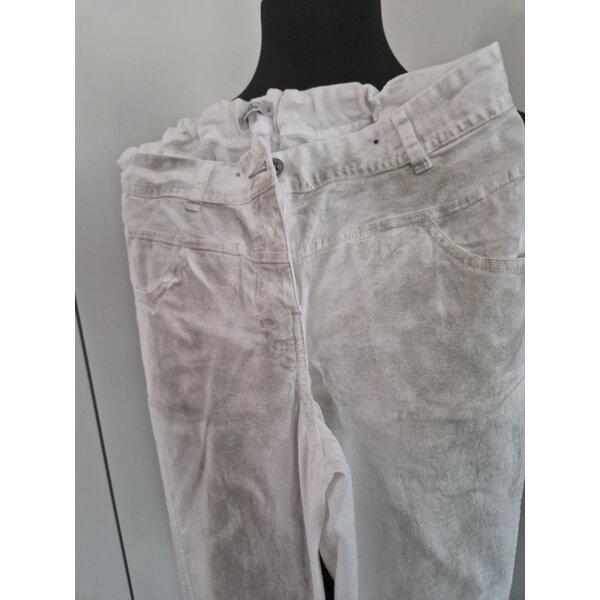 Biete eine weisse Hose in ausgefallener Optik.Wie alle meine Hosen hab ich hinten in den Bund einen Gummizug eingenäht, kann problemlos entfernt werden.Gesäßtaschen mit Reißverschluss.