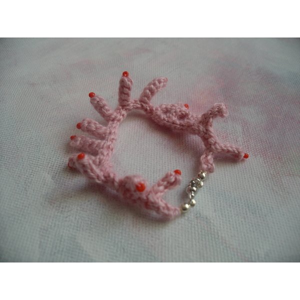 gehäkeltes Armband aus rosa Wolle und orangen Perlen
