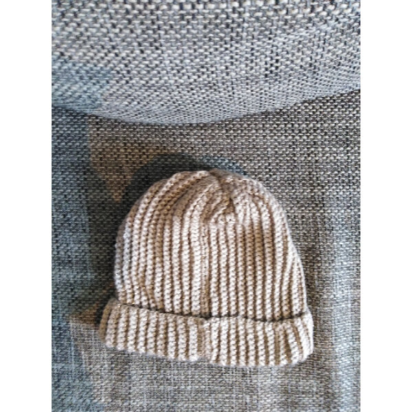 Häkelmütze im Rippenmuster in Raupe. Sie wurde für einen Kopfumfang bis 55 cm gemacht und ist durch das Muster dehnbar