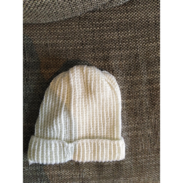 Häkelmütze im Rippenmuster in Weiß. Sie wurde für 55 cm Kopfumfang gehäkelt, ist aber durch das Muster dehnbar.