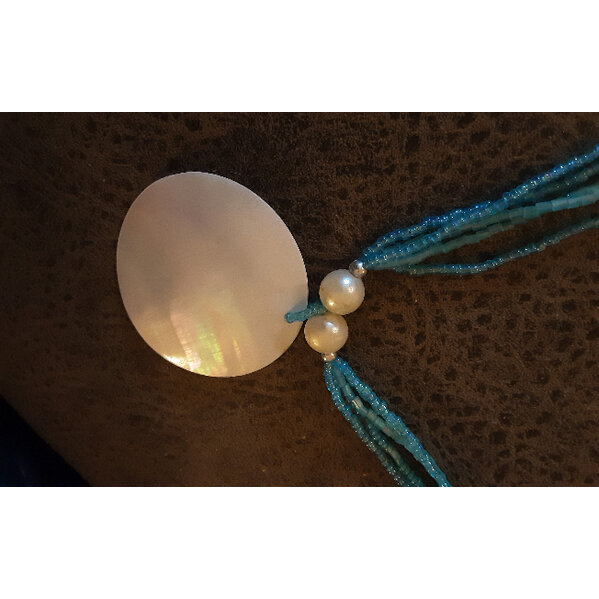 Halskette mit Perlmuttplatte blaue Kunstperlen 58 cm lang