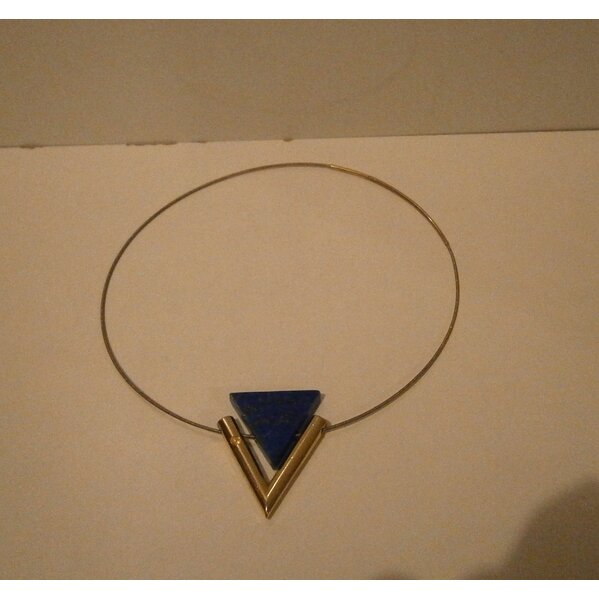 Halsreif, Metall, mit einem schweren zweiteiligen Anhänger - ein vergoldetes Metallteil in V-Form und ein Lapislazuli-Dreieck. Die Teile können auch einzeln getragen werden. Durchmesser etwa 14 cm, geöffnet ist er etwa 46 cm lang. Der Verschluß wird einfach ineinandergeschoben. Das Teil stammt aus den frühen 80er Jahren.