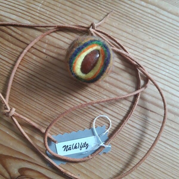 ein Carneol, eingefilzt, an einem Lederband...mit Knoten zum Verschieben, um die Länge zu variieren