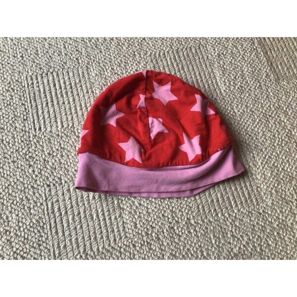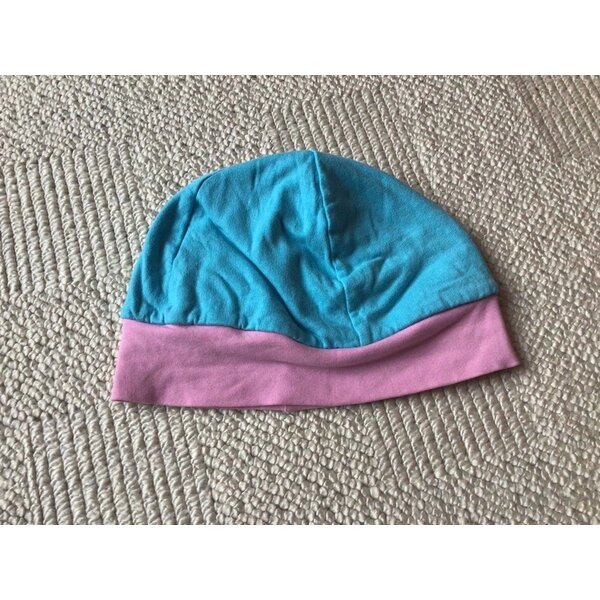 schöne Mütze aus Jersey zum beidseitigen Tragen - türkisblau und rot mit rosa Sternen