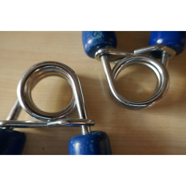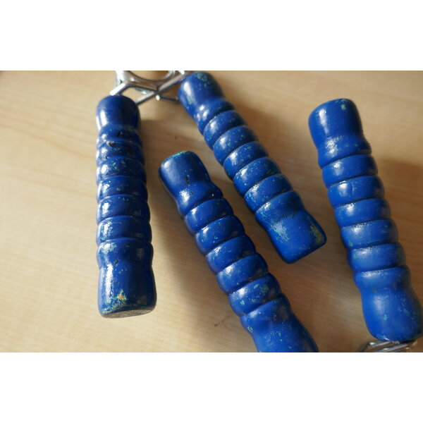 Blaue Holzgriffe mit Gebrauchsspuren.