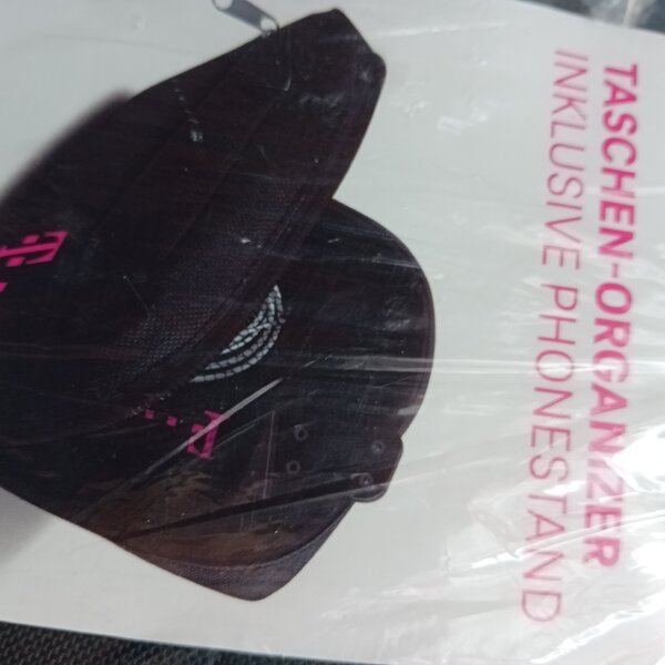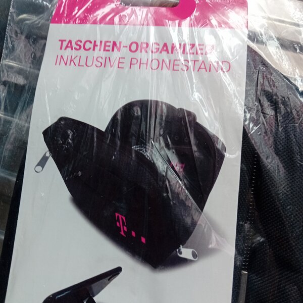 Handy Tasche, mit Handy-Standvorrichtung, Telekom- Logo. Innentaschen für Ladekabel, Reißverschluss außen für Karten. Perfekt zum Transportieren und Aufbewahrung von elektronischen Geräten.