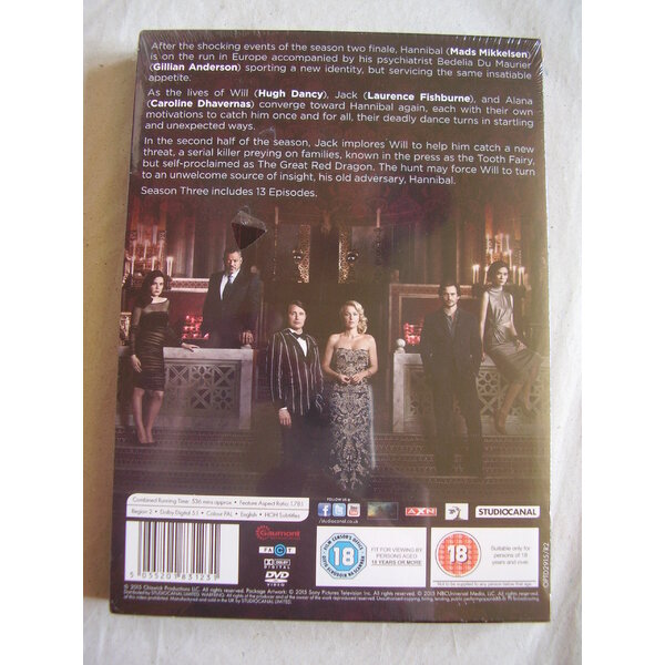 All 13 episodes from the third and final season of the US TV drama that examines the early relationship between up-and-coming FBI profiler Will Graham (Hugh Dancy) and eminent psychiatrist Hannibal Lecter (Mads Mikkelsen). The episodes are: 'Antipasto', 'Primavera', 'Secondo', 'Aperitivo', 'Contorno', 'Dolce', 'Digestivo', 'The Great Red Dragon', 'And the Woman Clothed With Sun...', 'And the Woman Clothed in the Sun', '...And the Beast from the Sea', 'The Number of the Beast Is 666' and 'The Wrath of the Lamb'.