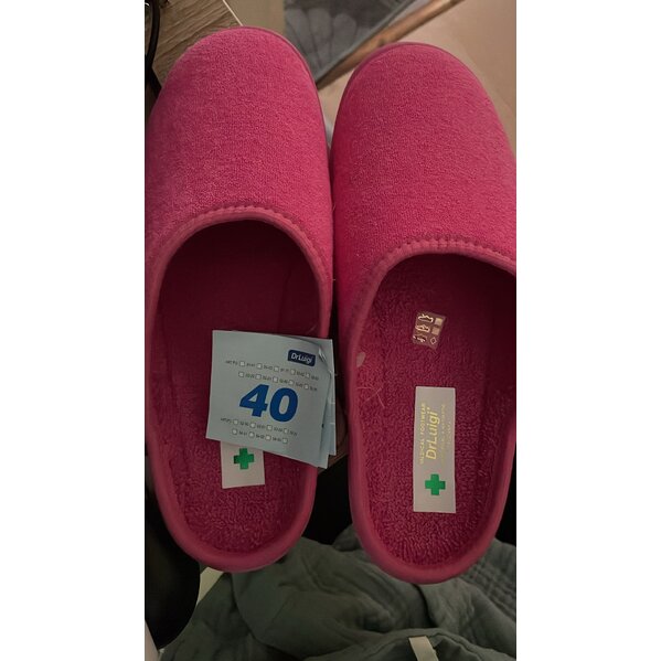 Bequeme, leichte Hausschuhe der Firma Dr. Luigi in Größe 40. In einem kräftigen Rosaton. Die Außenseite ist aus Baumwolle, die Schuhe sind bis 40 Grad waschbar. Rutschfeste Sohle.