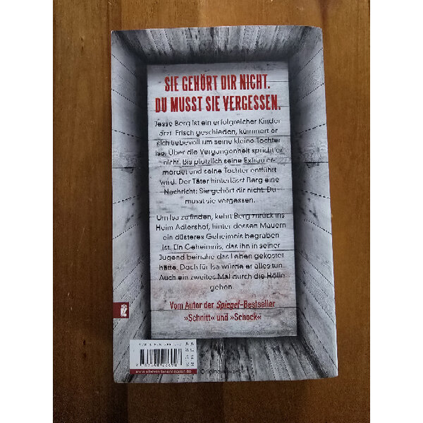 Jesse Berg ist ein erfolgreicher Kinderarzt. Frisch geschieden, kümmert er sich liebevoll um seine kleine Tochter Isa. Über seine Vergangenheit spricht er nicht. Bis plötzlich seine Exfrau ermordet und seine Tochter entführt wird. Der Täter hinterlässt für Berg eine Nachricht: Sie gehört dir nicht. Du musst sie vergessen. Berg ist klar, dass er selbst das Ziel des Anschlags ist. Eine langvergessene Schuld drängt ans Licht. Um Isa zu finden, muss er das tun, was er nie wollte: zurück in seine Vergangenheit. Zurück ins Heim. Dort hat er gelernt, sich zu wehren, und dort wäre er beinahe getötet worden. Berg nimmt die Kampfansage an. Denn für Isa würde er alles tun. Auch ein zweites Mal durch die Hölle gehen.