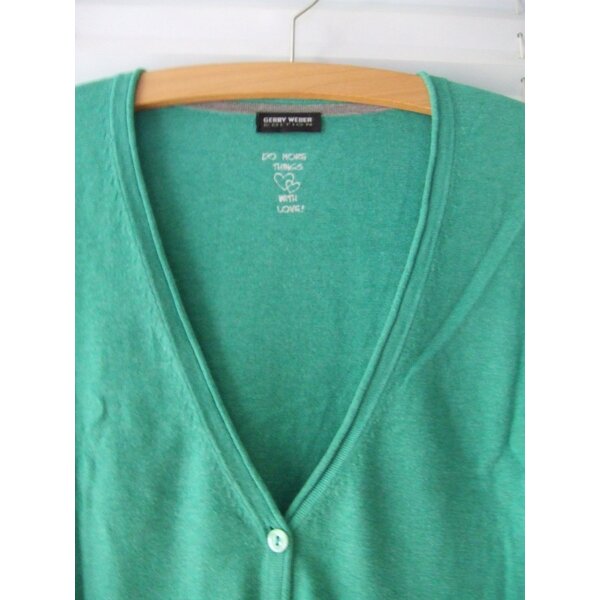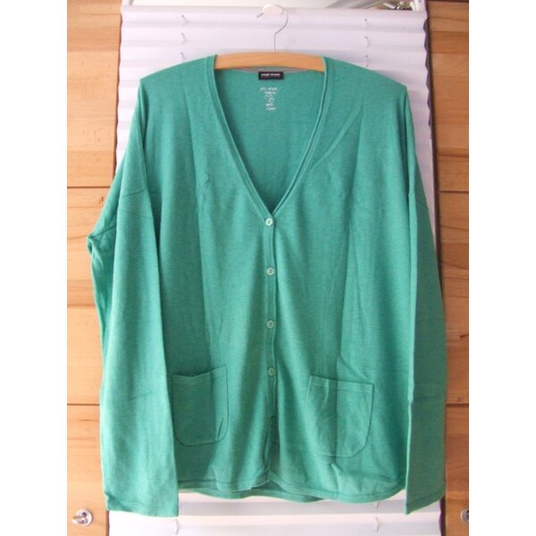 Schöne leichte, locker geschnittene Strickjacke in warmem Minzgrün. Unten kein gerader Abschluss, sondern zu den Seiten leicht nach oben abgerundet. Länge ca. 66 cm, von Achsel zu Achsel ca. 69 cm. Material unbekannt, da der Waschzettel bis auf die Waschanleitung herausgeschnitten ist; dürfte aber ein hoher Viskoseanteil sein. Waschbar bis 30 Grad.