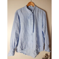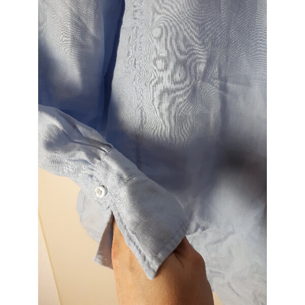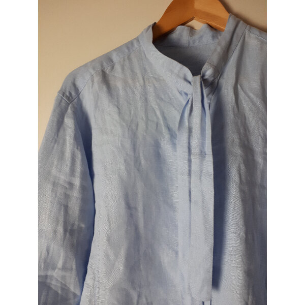 Aus einem Hemd umgenähte Hemdbluse mit Schluppenkragen und spitzen Manschetten. Saum abgerundet hinten länger. Brustweite 63cm, Länge vorne 61cm hinten 79cm.