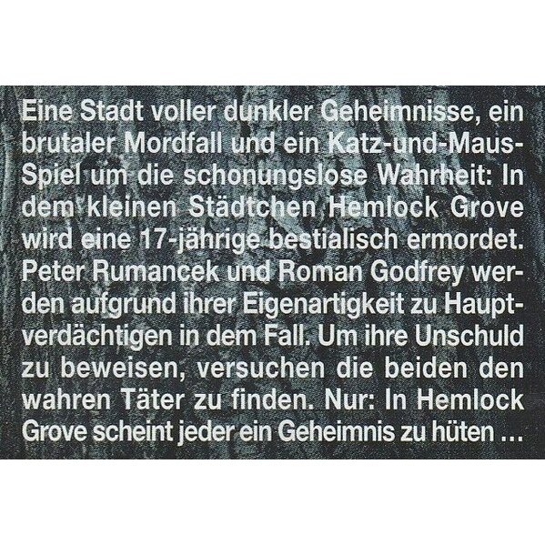 Eine Stadt voll dunkler Geheimnisse, ein brutaler Mordfall und ein Katz-und-Maus-Spiel um die schonungslose Wahrheit - in dem kleinen Städtchen Hemlock Grove wird eine 17-Jährige brutal ermordet. Peter Rumancek und Roman Godfrey werden aufgrund ihrer Eigenartigkeit zu Hauptverdächtigen in dem Fall. Um ihre Unschuld zu beweisen, versuchen die beiden, den wahren Täter zu finden. Das Problem: In Hemlock Grove hütet jeder ein Geheimnis. Werden sie so in der Lage sein, das wahre Monster unter ihnen zu finden?