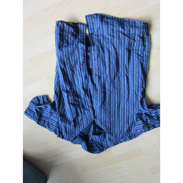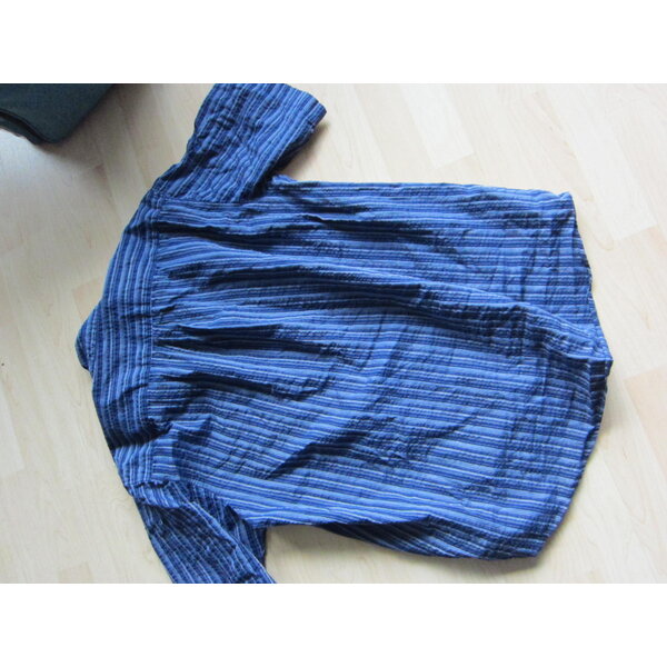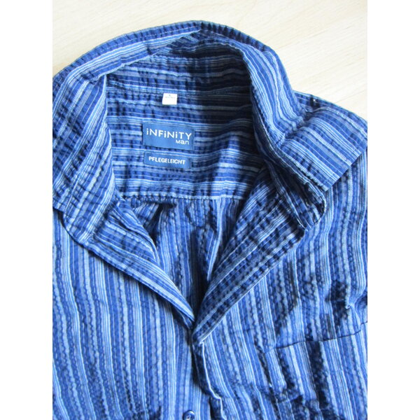 Wir bieten hier ein blaues längsgestreiftes Hemd für Herren in Kragengröße 41/42 an. Die einfache Brustweite ist 58 cm und die Gesamtlänge 75 cm. Aus 60 % Baumwolle und 40 % Polyester. Bügelfrei.