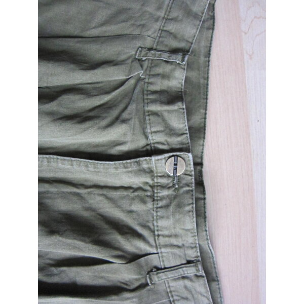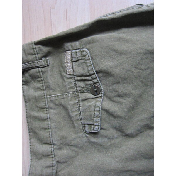 Es handelt sich um einen Stoffhose von Camaro aus 100 % Baumwolle. Sie hat Bundfalten, zwei auf jeder Seite. Sie hat drei Taschen, zwei vorne und eine Potasche mit Knopf. die einfache Bundweite ist 40 cm und die Gesamtlänge 100 cm.