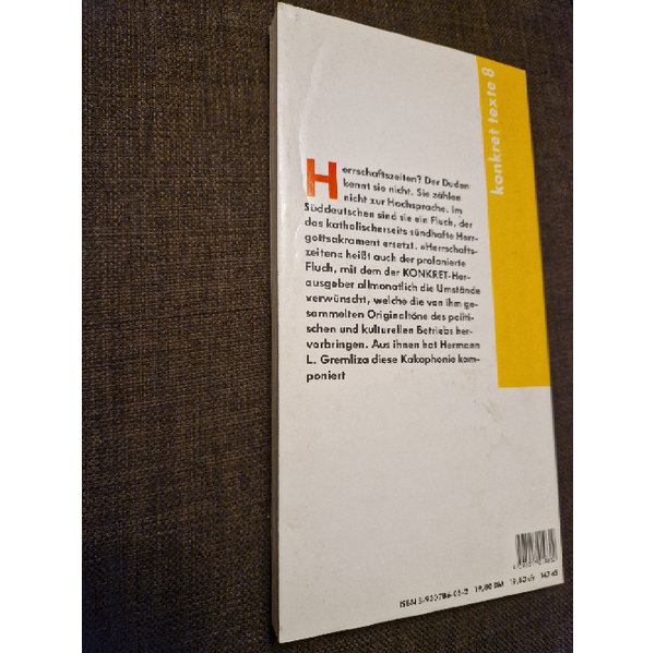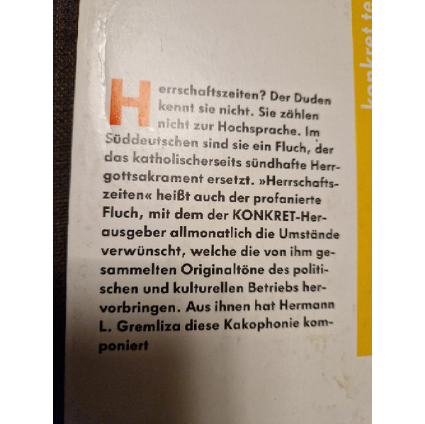 Herrschaftszeiten? Der Duden kennt sie nicht. Sie zählen nicht zur Hochsprache. Im Süddeutschen sind sie ein Fluch, der das katholischerseits sündhafte Herrgottsakrament ersetzt. "Herrschaftszeiten" heißt auch der profanierte Fluch, mit dem der KONKRET-Herausgeber allmonatlich die Umstände verwünscht, welche die von ihm gesammelten Originaltöne des politischen und kulturellen Betriebs hervorbringen. Aus ihnen hat Hermann L. Gremliza diese Kakophonie komponiert.