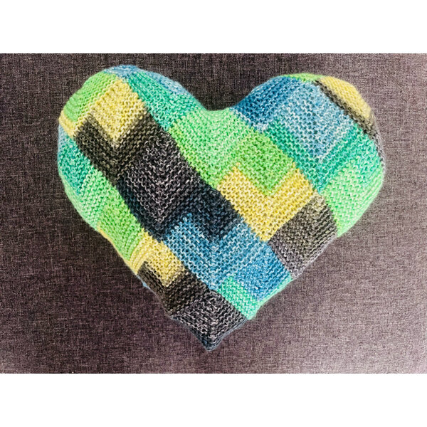 In Patchworkoptik aus Socken- bzw. Babywolle gestrickt und mit Polyesterfüllwatte ausgestopft.