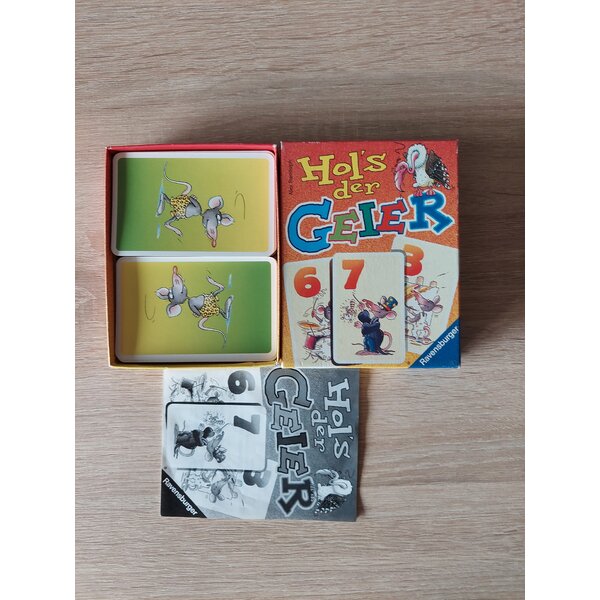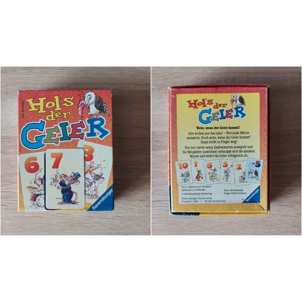 Alle wollen kostbare Mäuse sammeln. Doch wehe wenn der Geier kommt. Dann ist alle Liebsmüh vergebens! Einen Teil der Mäusepunkte frisst er gnadenlos auf. Nur wer clever seine Zahlenkarten ausspielt und die Mitspieler austrickst, schnappt sich die meisten Mäuse und wehrt die Geier erfolgreich ab.