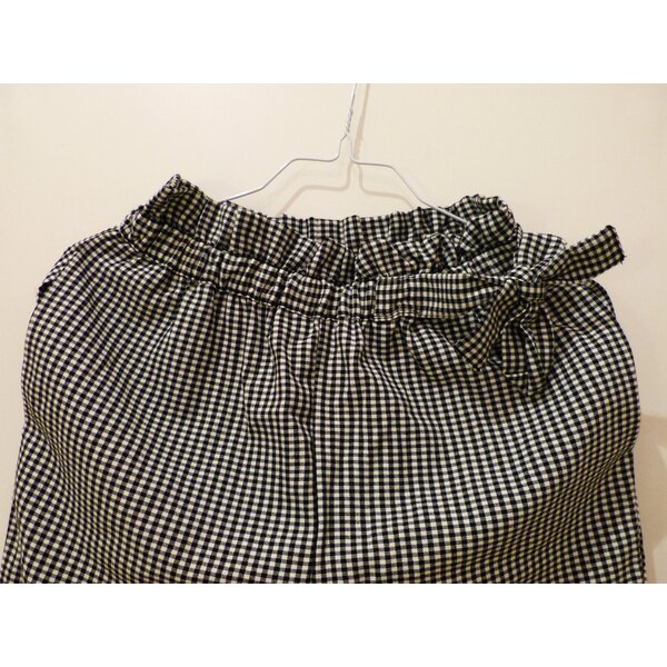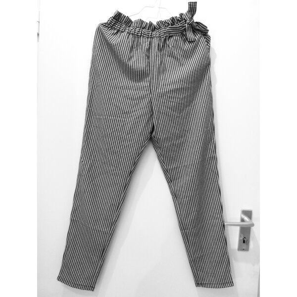 Hose mit kleinem Vichy Karo in schwarz-weiß. Relaxed Fit, mit hoch geschnittenem, gesmoketem Gummibund an dem eine süße Schleife angebracht ist.