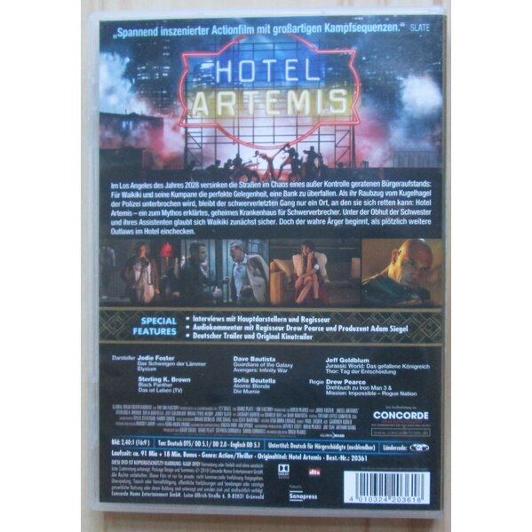 Im Los Angeles des Jahres 2028 versinken die Straßen im Chaos eines außer Kontrolle geratenen Bürgeraufstands: Für Waikiki und seine Kumpanen die perfekte Gelegenheit, eine Bank zu überfallen. Als ihr Raubzug vom Kugelhagel der Polizei unterbrochen wird, bleibt der schwerverletzten Gang nur ein Ort, an den sie sich retten kann: Hotel Artemis – ein zum Mythos erklärtes, geheimes Krankenhaus für Schwerverbrecher. Unter der Obhut der Schwester und ihres Assistenten glaubt sich Waikiki zunächst sicher. Doch der wahre Ärger beginnt, als plötzlich weitere Outlaws im Hotel einchecken.